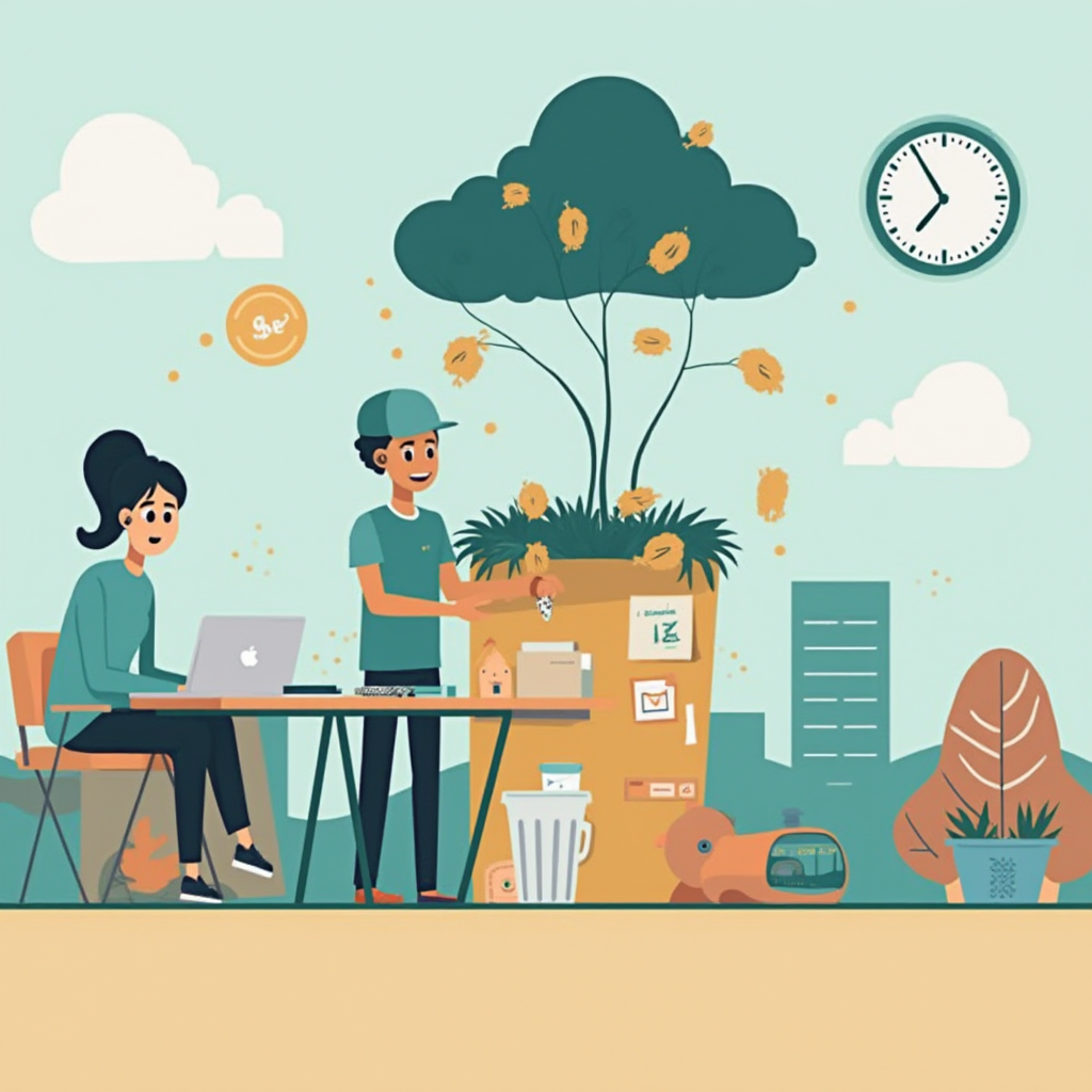**Prompt para la Imagen 1:** Una imagen que represente la unión entre prosperidad financiera y responsabilidad global. Podría ser una mano sosteniendo un brote verde que crece dentro de un círculo de monedas o símbolos financieros, simbolizando el crecimiento sostenible y la inversión consciente. Alternativamente, podría ser una composición que combine elementos urbanos modernos (edificios, tecnología) con elementos naturales y verdes (árboles, energía solar), representando la integración de la sostenibilidad en la economía. Utilizar colores verdes, dorados y tonos tierra para transmitir crecimiento, prosperidad y conexión con la naturaleza.**